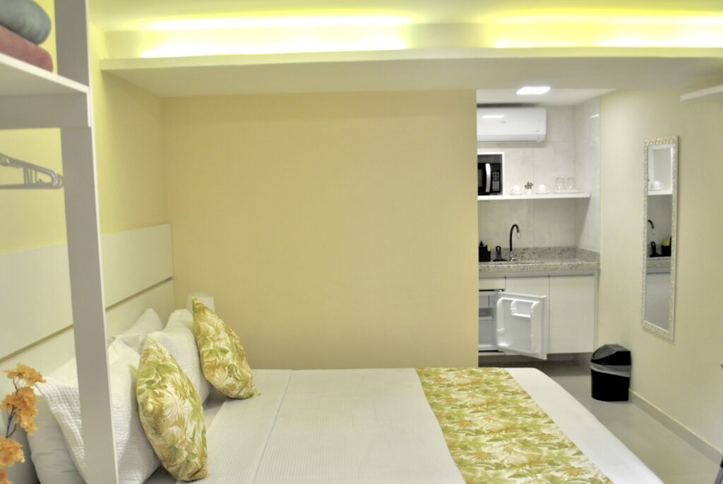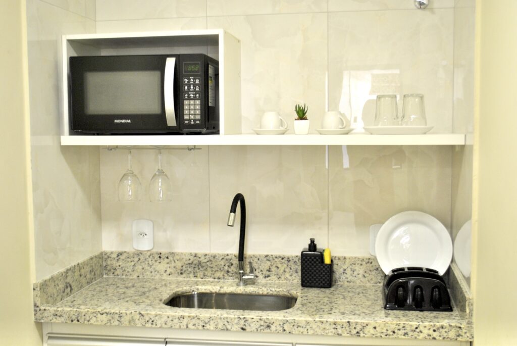 - Cozinha de Apoio Profissional: Micro-ondas, frigobar, chaleira elétrica, além de um kit completo de talheres e copos. Perfeito para preparar lanches rápidos ou aquele café da manhã especial.