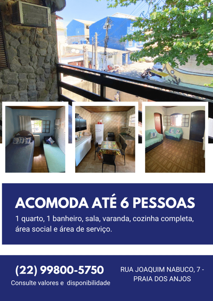 Esta é a oportunidade perfeita para curtir o feriado ou suas férias com a família em Arraial do Cabo, com o conforto que você merece. Localizada na Rua Joaquim Nabuco, 7 (atrás do Clube Apolo), você estará literalmente com o pé na areia da Praia dos Anjos.